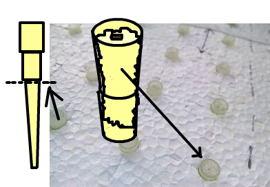 溶液を測る機械に使われる、黄色いチップを使用しての手作り水耕栽培ミニミニポット。